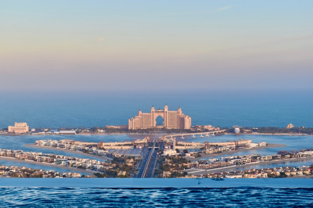 The next morning, I had an exciting adventure planned: I wanted to watch the sunrise from the Aura Skypool, which is the world’s tallest rooftop swimming pool, overlooking Palm Jumeirah Island in Dubai. Watching the sunrise from there was amazing. The gentle morning sun made the city’s skyline look beautiful, with shades of orange and pink painting the sky. It was so peaceful and calm, and it made me feel amazed and happy.